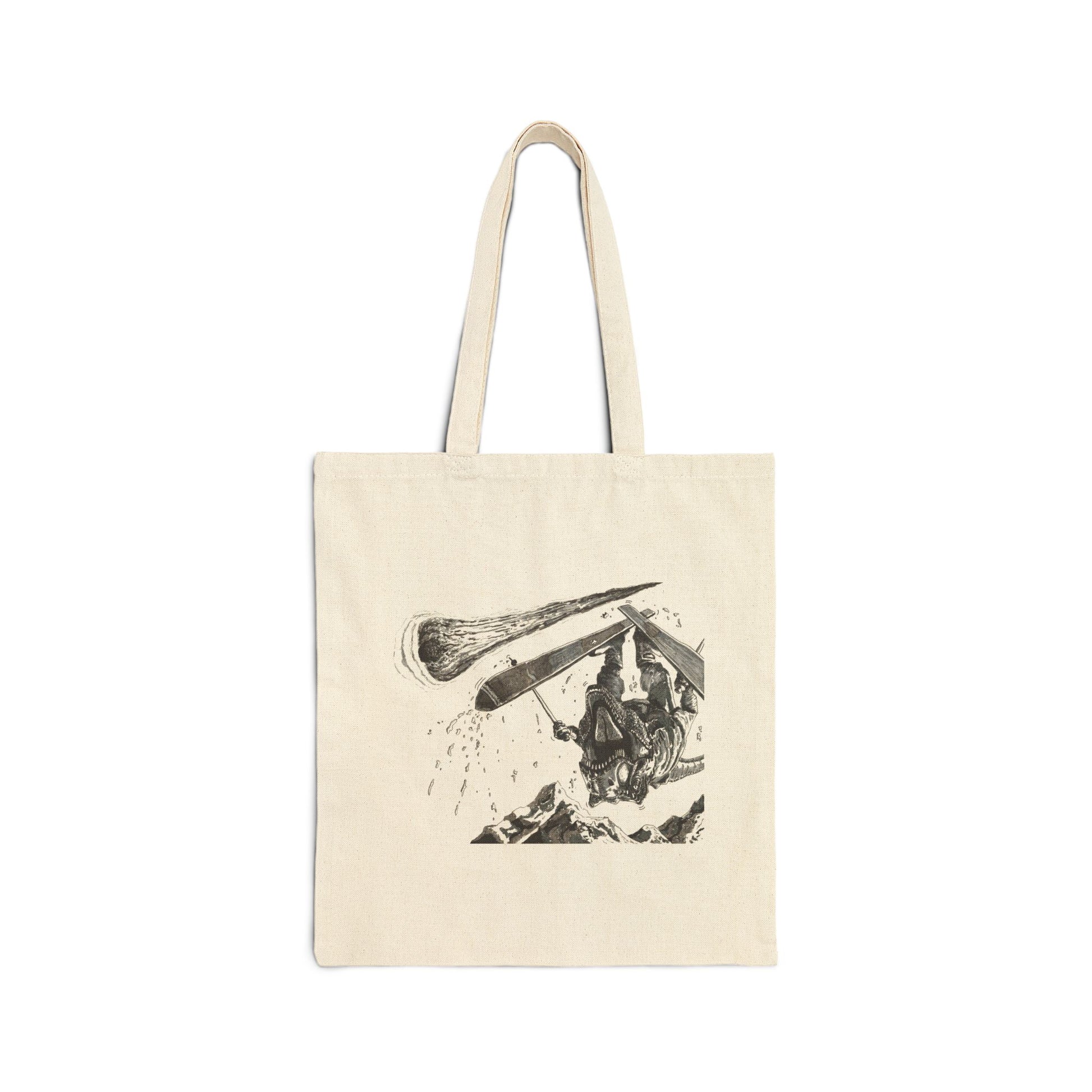 A T-Rex hitting the slopes, doing some tricks. There's a nasty little rock coming in behind him. Carry around your fossils in this bag.