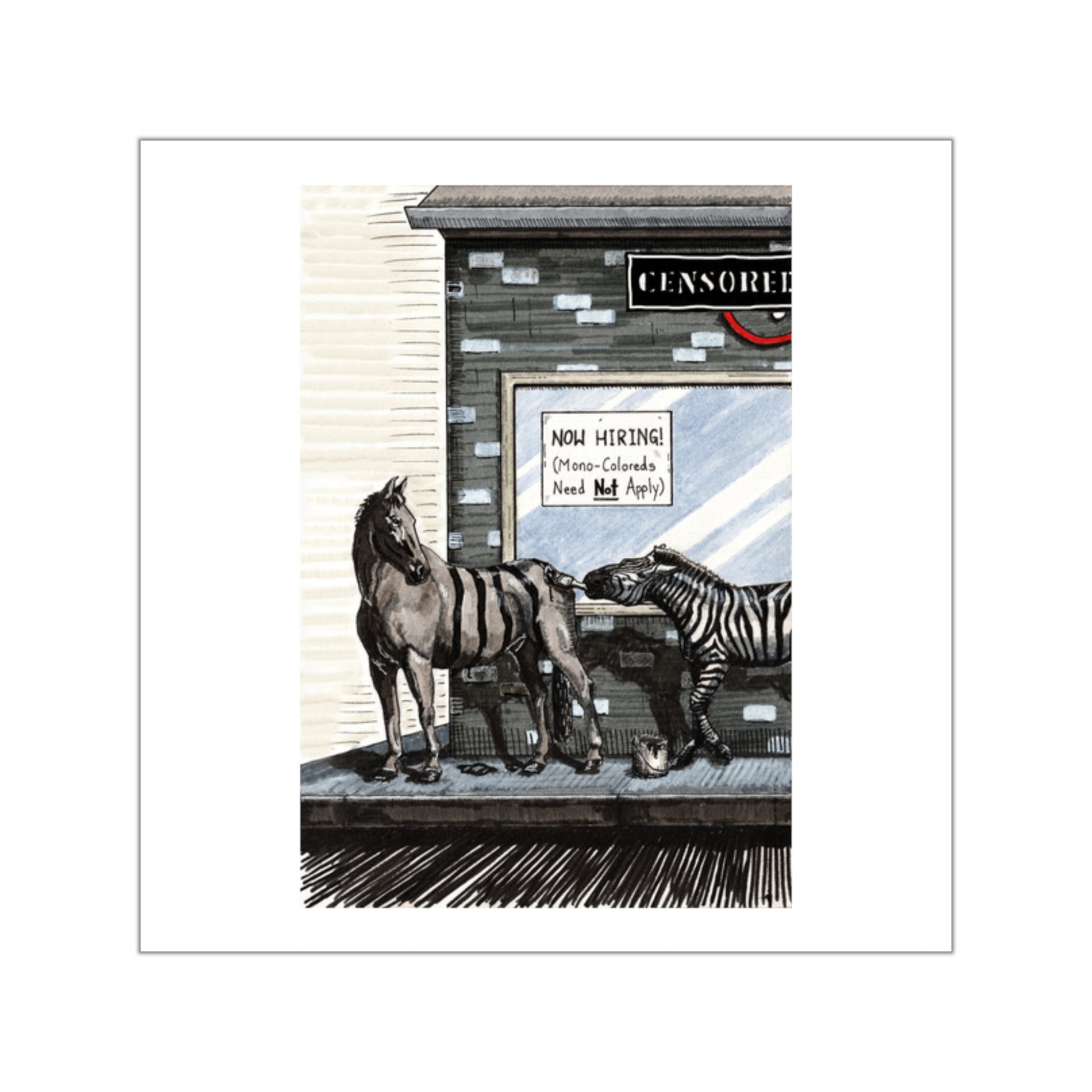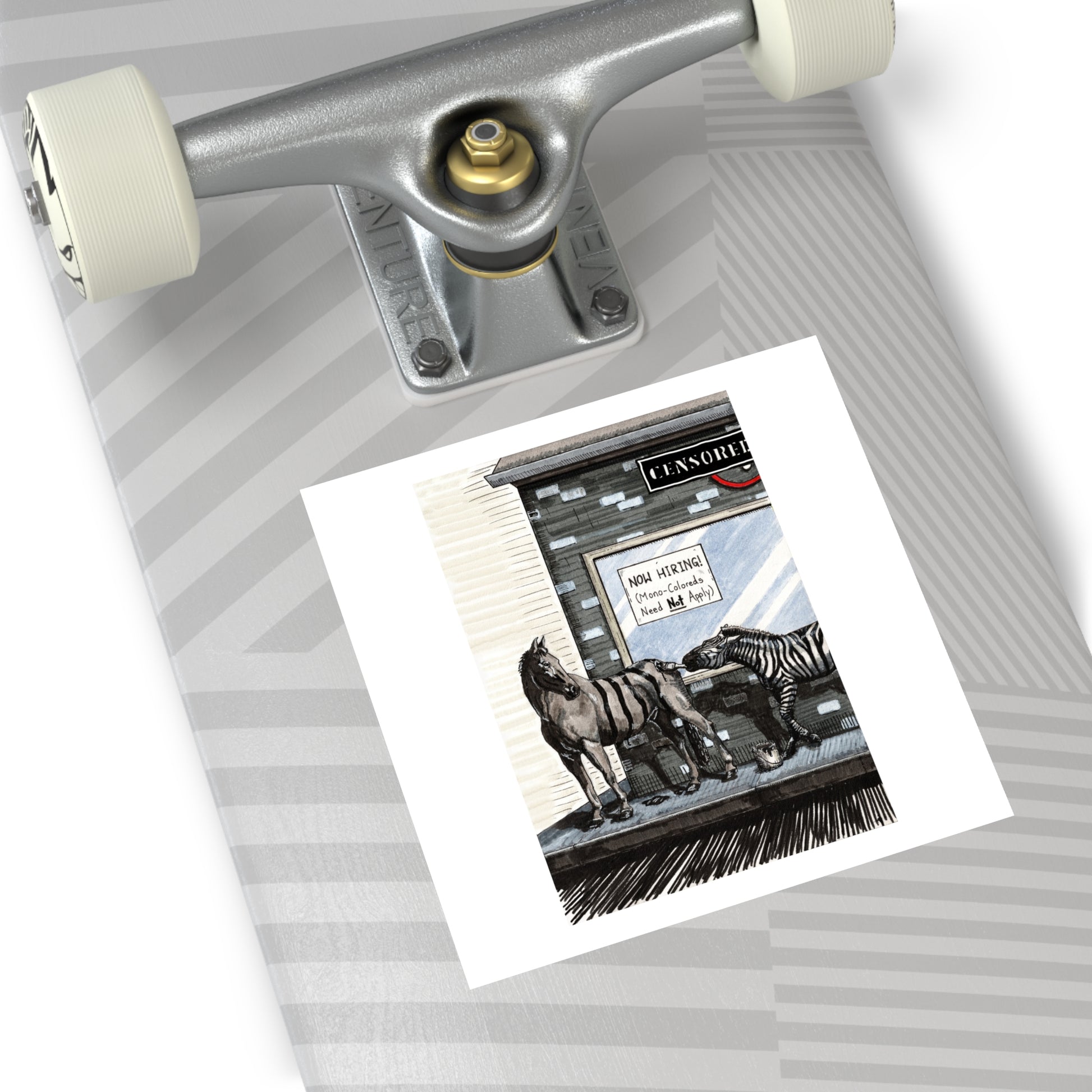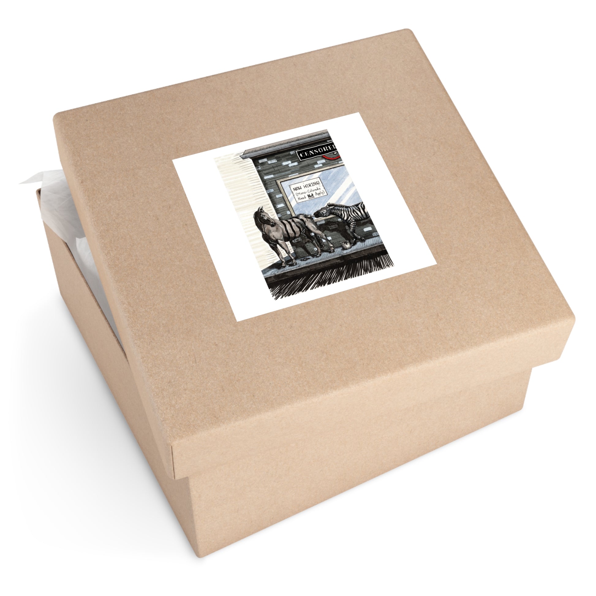 A zebra bravely paints stripes on a horse. That's an IHOP behind him. On the back is the sticky part.