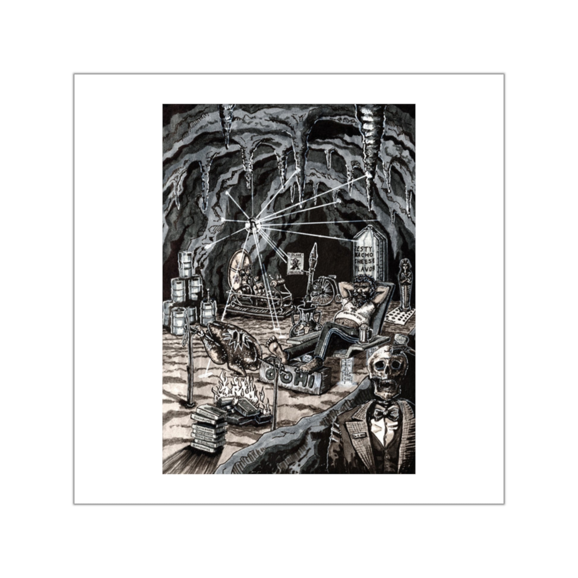 A caveman with an impressive assortment of goodies from across many ages. On the back is the sticky part.