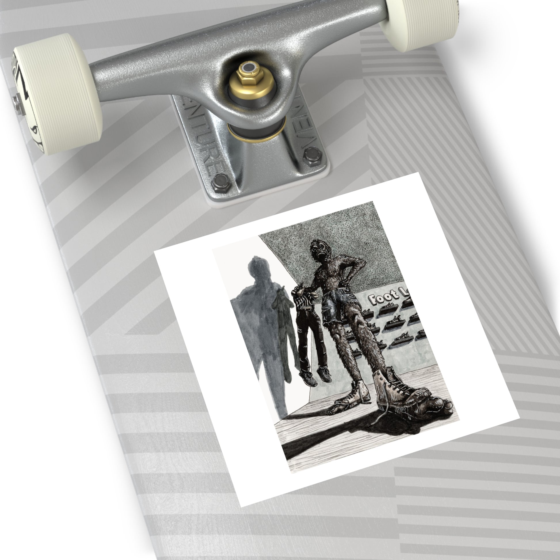 A sasquatch looks for shoes that compliment his new jorts, but keeps hitting a speedbump. On the back is the sticky part.