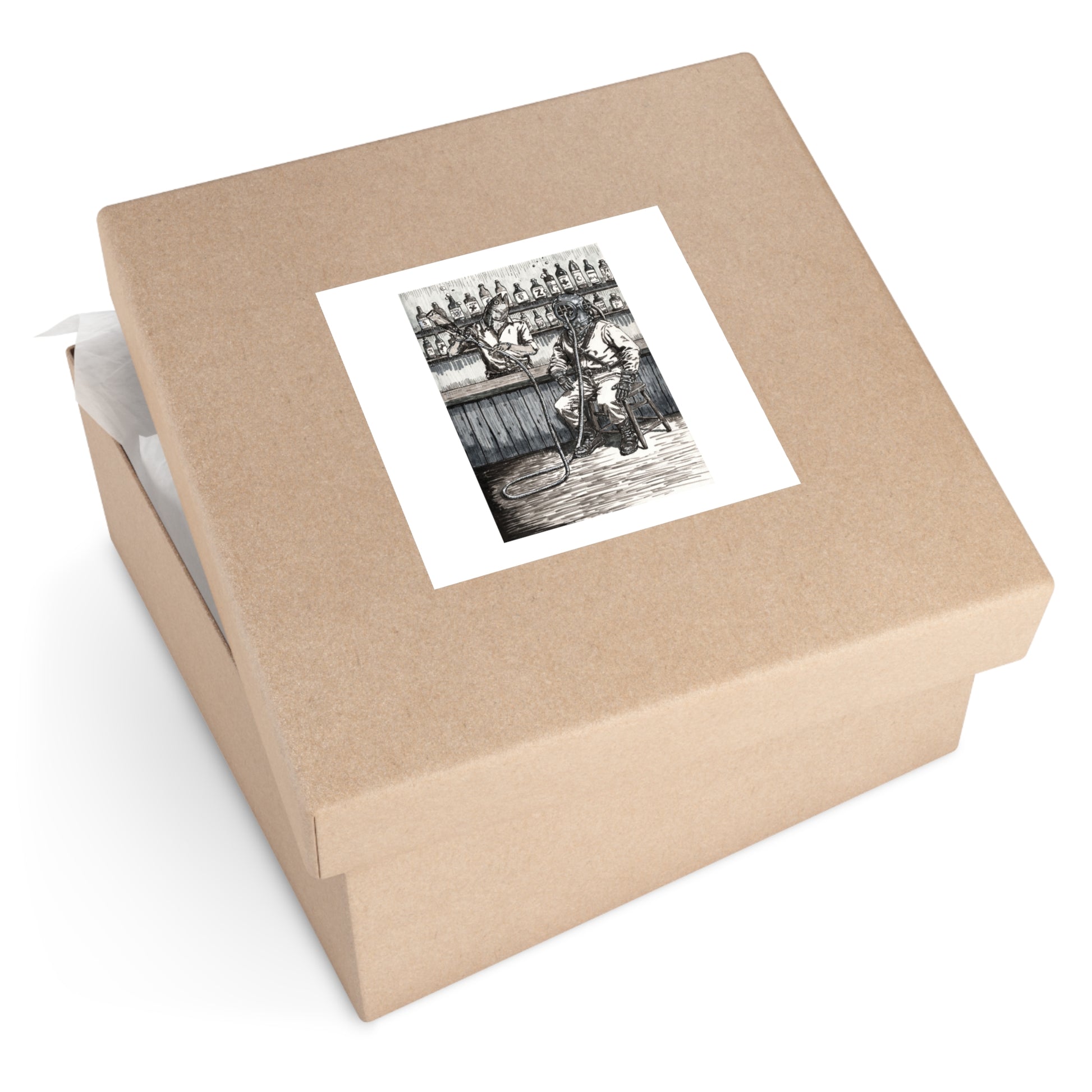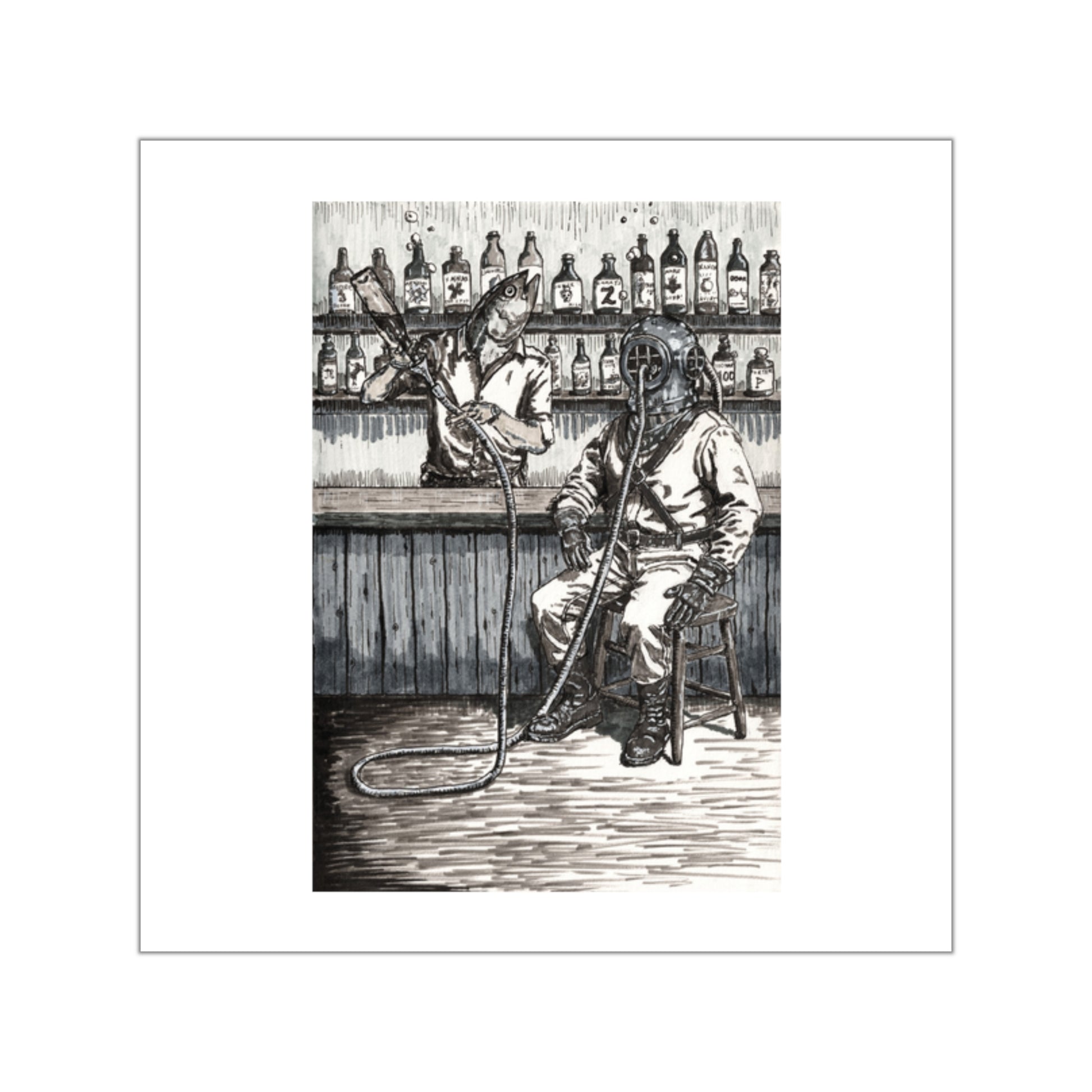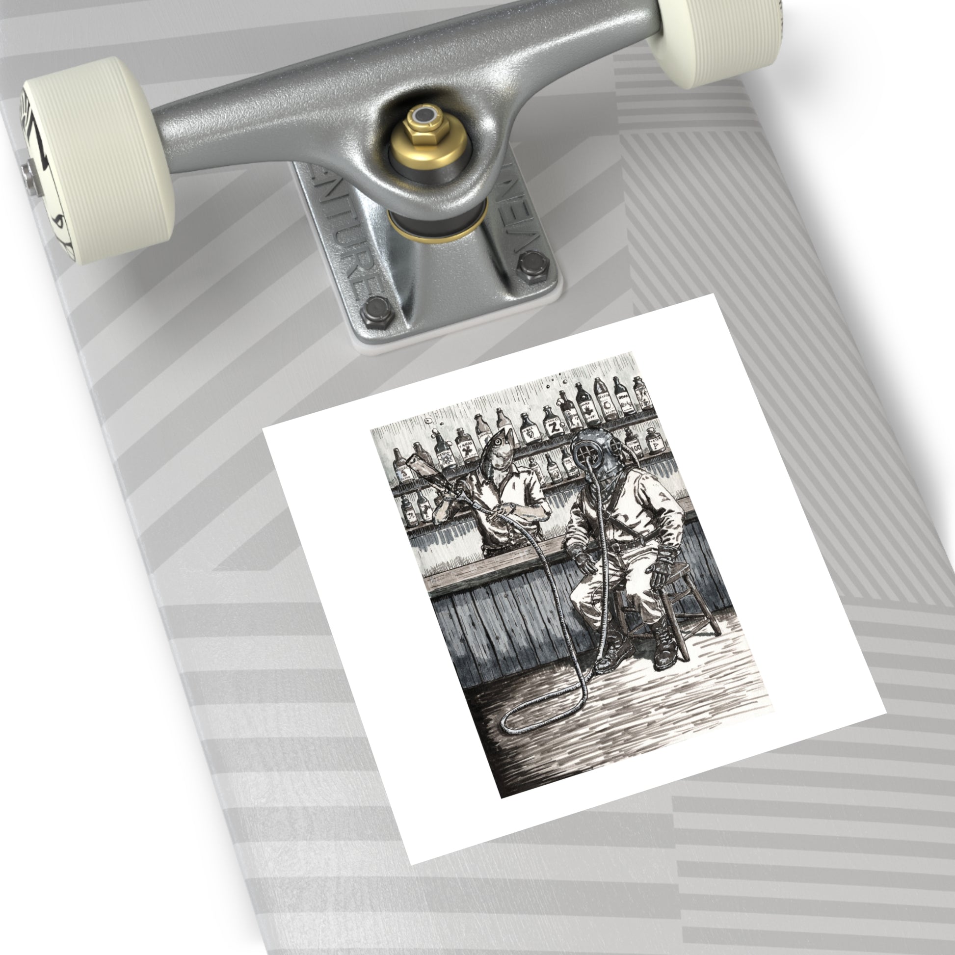 A deep sea diver enjoys an underwater happy hour. On the back is the sticky part.