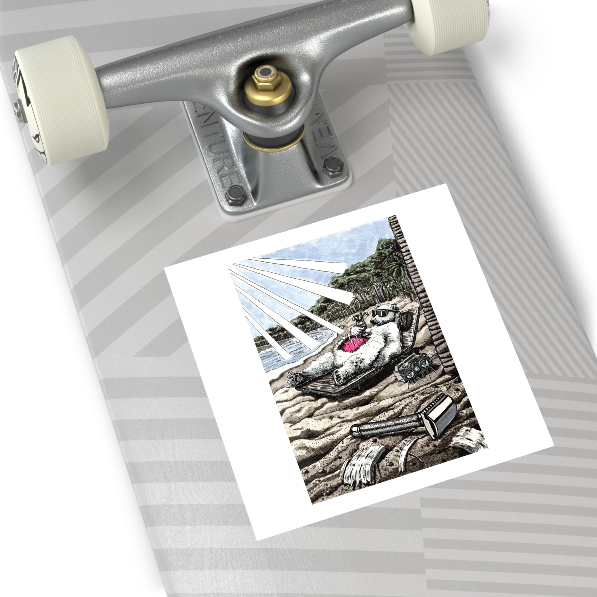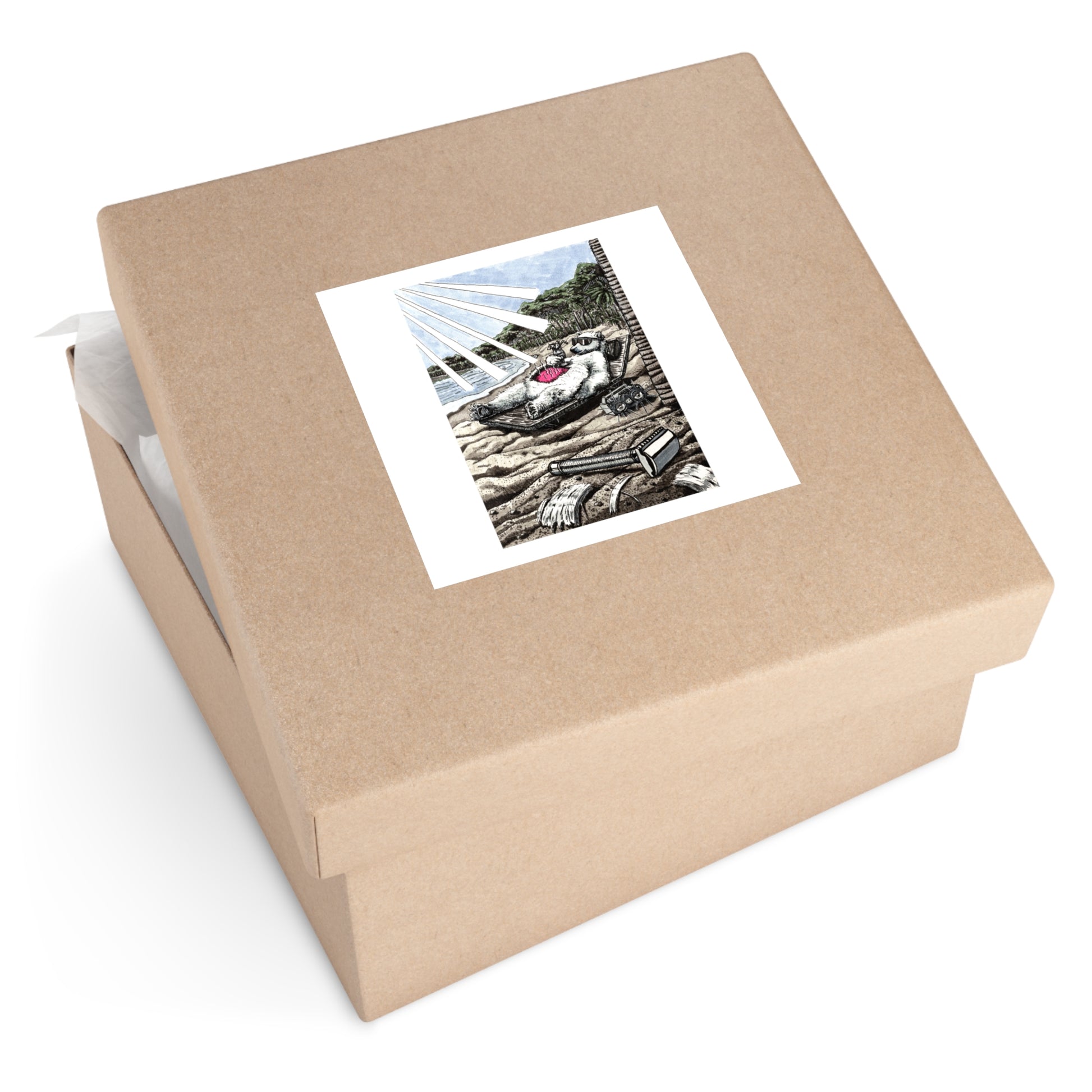A polar bear soaking in some sweet rays and listening to some Weezer. On the back is the sticky part.