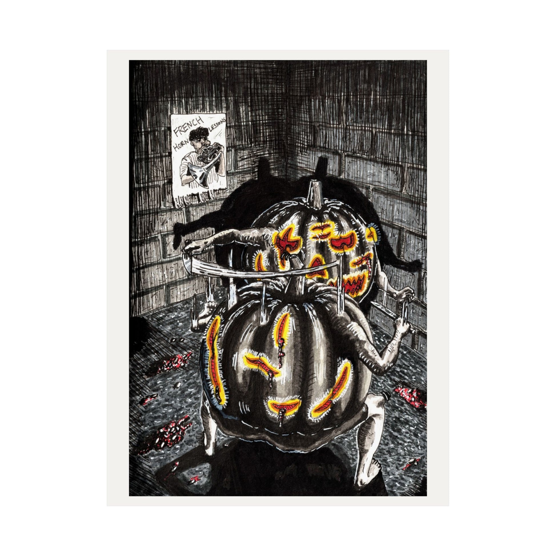 Two Jack-o-Lanterns take slices out of each other in a dark corner.