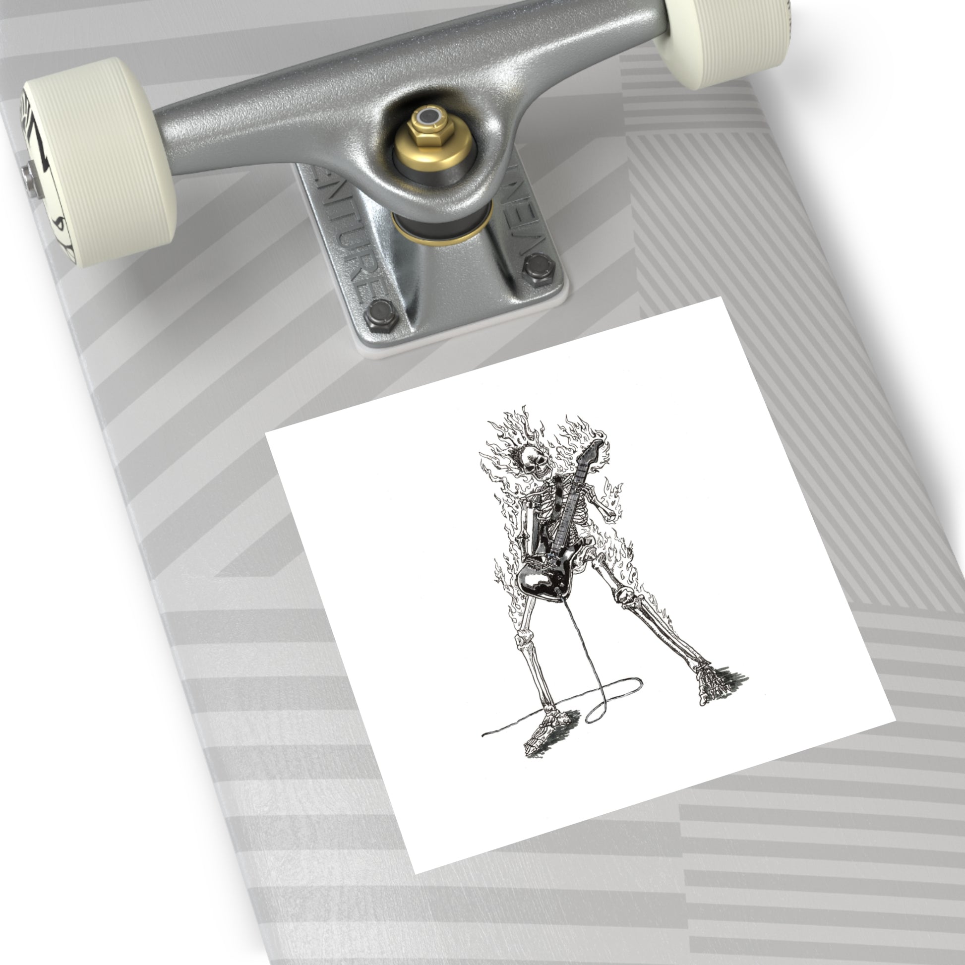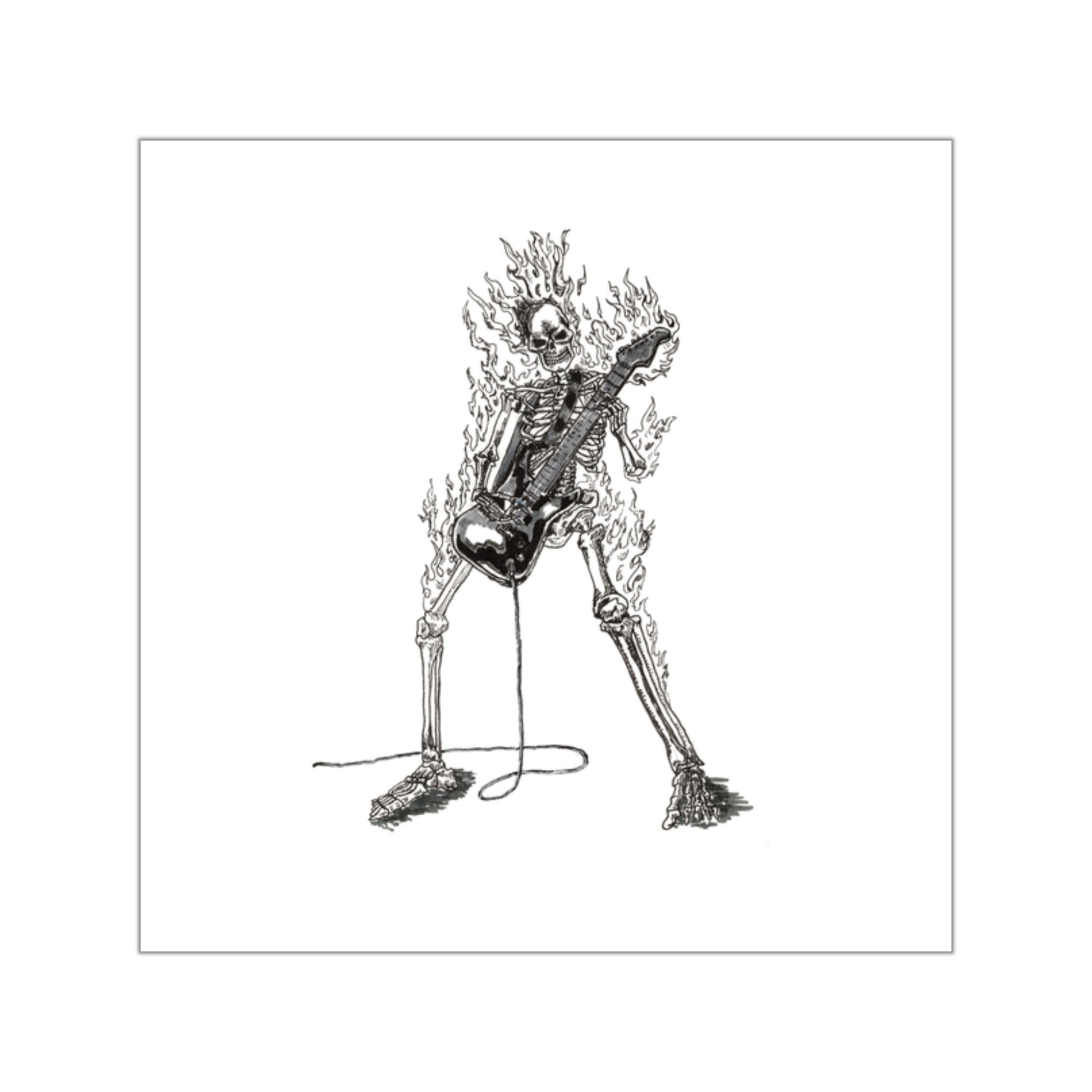 This guitarist is long dead and very on-fire. And yet he perseveres, on the back is the sticky part.